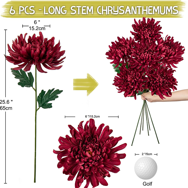 ARTIFICIAL SILK CHRYSANTHEMUM FLOWERS: The petals are made of high-quality silk, and also coated with some latex, which makes the flowers realistic and lifelike. Using a powder planting technique to create natural frost green foliage, the long stems are covered with realistic flocking, details carefully designed to mimic real plants. Give your victorious moments and celebratory revels a whole new triumphant look and festive feel by adorning with our huge Victory Mum Silk Flowers.