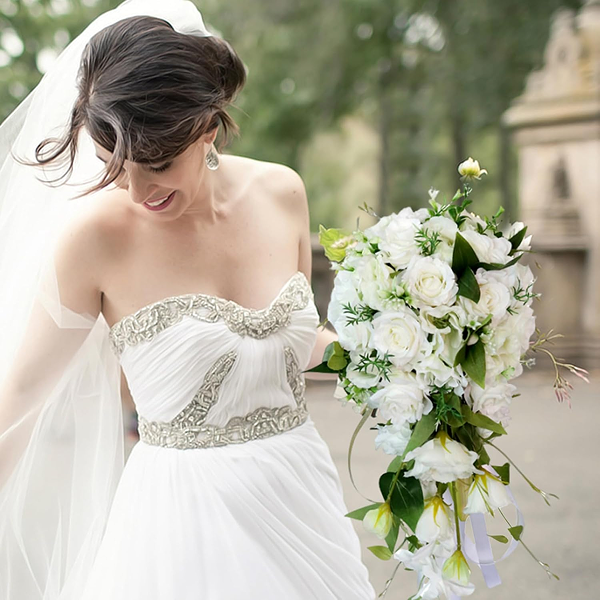 Romantic Elegance in Bloom: Elevate your wedding day with this Romantic Bridal Bouquet, a cascading art work of artificial roses that captures the essence of romance and elegance. The roses are arranged in a cascading design, creating a stunning visual effect reminiscent of a romantic waterfall. Its teardrop shape adds a touch of drama and sophistication to your bridal ensemble.